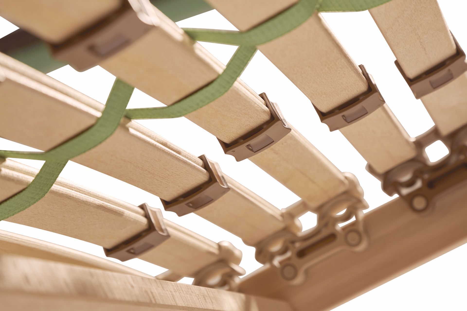 • Alle Verstellmöglichkeiten erfolgen über eine metallfreie Holzrasterung. Die Leistenauflage aus echtem Kork schont den Bezug der Matratze und verhindert, dass sie rutscht
